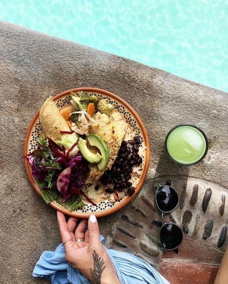 In the mornings, a light breakfast is available starting around 7am with things like chia pudding or oatmeal, yogurt, fresh fruit, juices and coffee and tea. A full breakfast is available at 9am (perfectly timed for post-yoga) with things like eggs, breads and fruit spreads, and a variety of other savoury delights. In the rotating lunch and dinner buffets, guests can expect dishes like swordfish ceviche, grilled fish, sopes, meat, rice and beans and freshly made tortillas, hot and cold soups, salads, and much more. The hotel can accommodate many diets, including vegan, vegetarian, pescatarian, low to no sugar, gluten-free and any other special dietary concerns. You’ll find filtered water available on tap (eliminating the waste associated with bottled water), as well as a variety of fruit and herbal infusions and natural juices to stay hydrated. At Marty’s bar, the cocktail menu leans into what’s grown on site with herbs, spices and tropical fruits prominently featured. The basil margarita is an elevated and refreshing spin on an old classic.